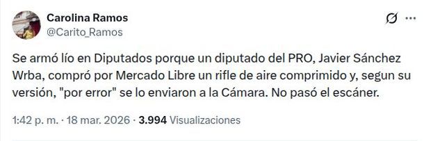 “Se armó lío en Diputados porque un diputado del PRO, Javier Sánchez Wrba, compró por Mercado Libre un rifle de aire comprimido y, segun su versión, “por error” se lo enviaron a la Cámara. No pasó el escáner”, comentó la periodista Carolina Ramos en X.