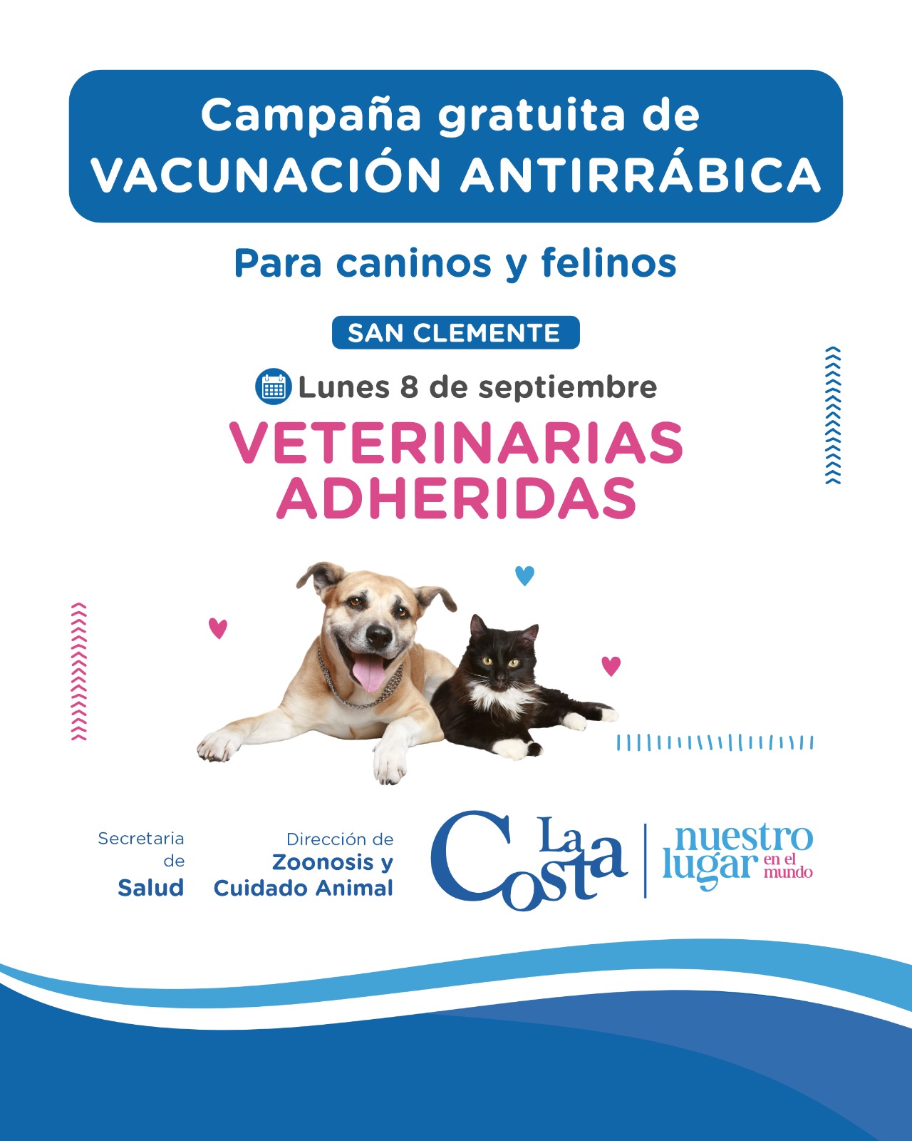 En esta oportunidad se informa a la población que a partir del día 8 de septiembre, y en el marco de la Campaña se encuentra disponible la aplicación de la Vacuna Antirrábica de forma gratuita en las siguientes Veterinarias Adheridas de la localidad de San Clemente del Tuyú: