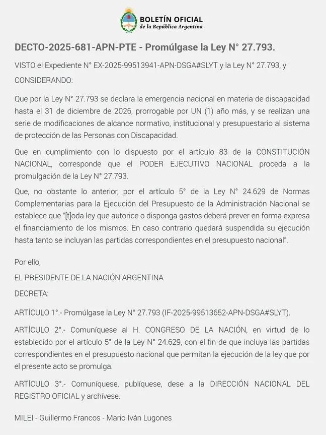 En el Boletín Oficial de este lunes se publicó la promulgación de la Ley N° 27.793, que declara la emergencia nacional en materia de discapacidad hasta el 31 de diciembre de 2026, con posibilidad de prórroga por un año más. En el mismo día, se oficializaron las bajas en retenciones al campo