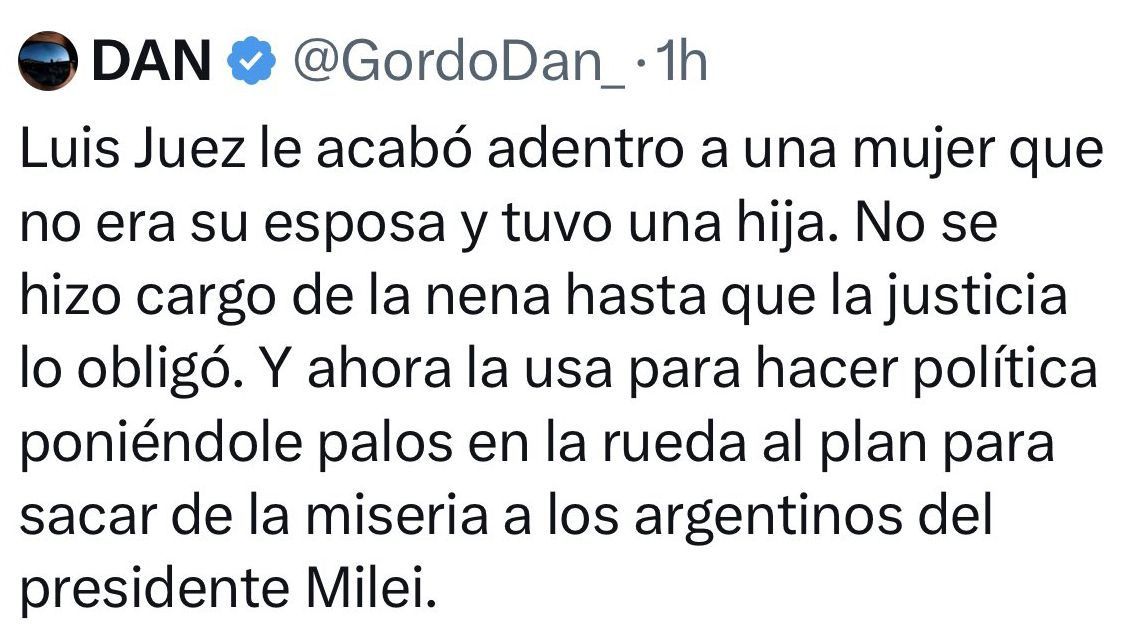 “Luis Juez le acabó adentro a una mujer que no era su esposa y tuvo una hija. No se hizo cargo de la nena hasta que la justicia lo obligó. Y ahora la usa para hacer política poniéndole palos en la rueda al plan para sacar de la miseria a los argentinos del presidente Milei”.