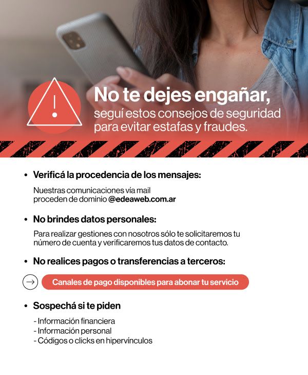 Ante los intentos de estafas mediante llamados telefónicos, mensajes de WhatsApp o correos electrónicos de personas que se hacen pasar por gestores comerciales de la empresa, EDEA recuerda a sus usuarios que:
