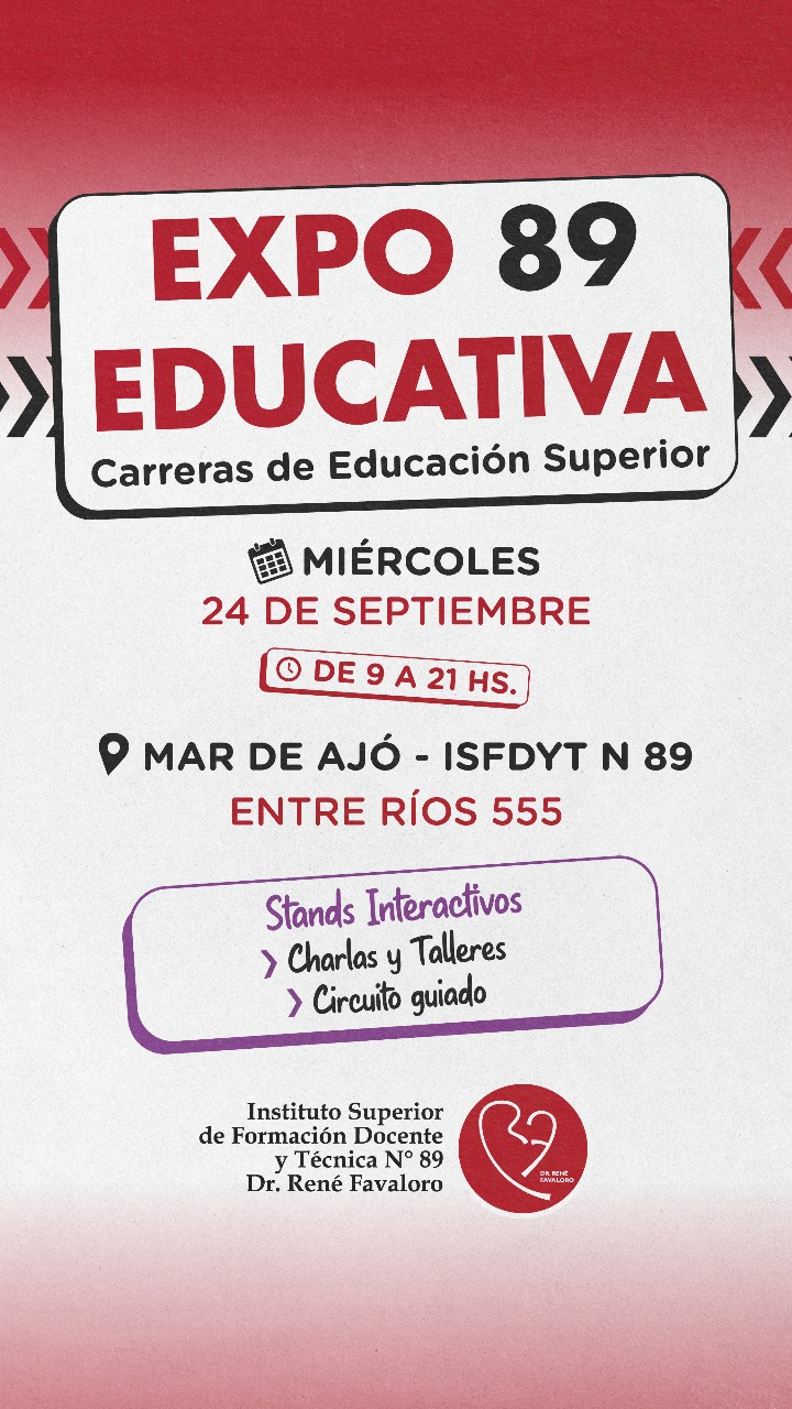 El Instituto Superior de Formación Docente y Técnica Nº 89 de La Costa invita a la comunidad educativa y al público en general a participar de la Expo89 2025: “Conocé nuestra oferta educativa”, que se desarrollará el miércoles 24 de septiembre, de 9.00 a 21.00, en la sede institucional ubicada en Entre Ríos 555, Mar de Ajó Norte.