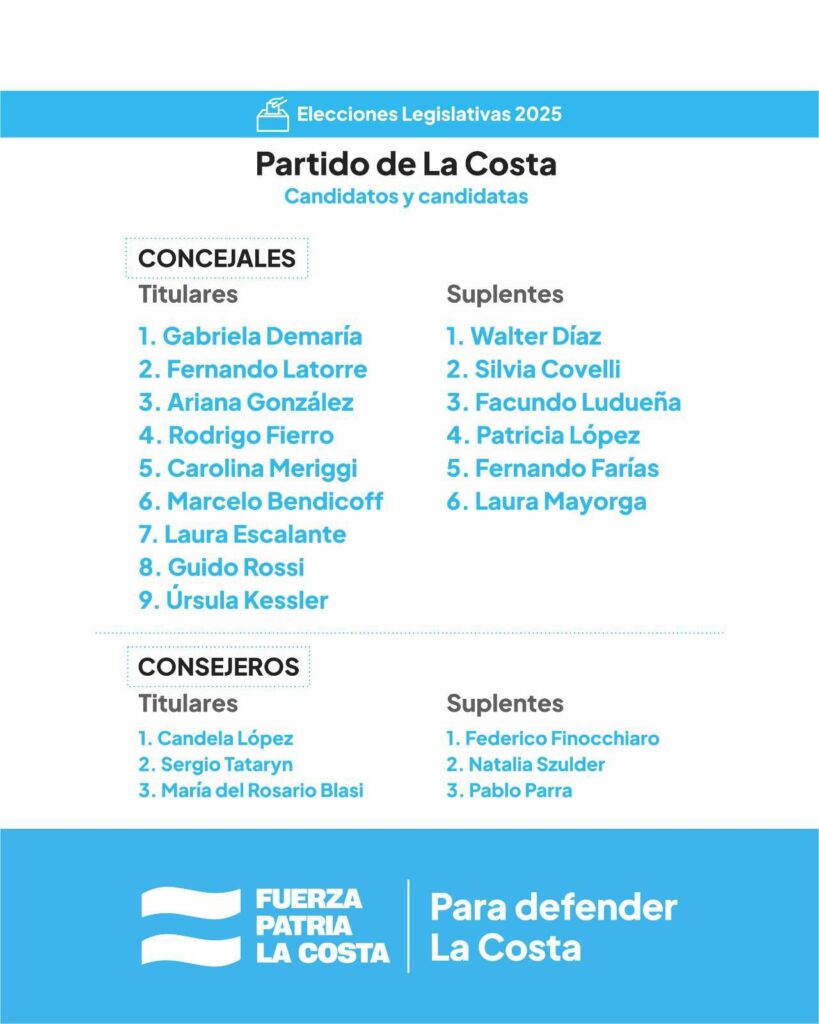 Este 7 de septiembre, el Partido de La Costa elige 9 concejales y representantes al Senado bonaerense. En ese marco, Fuerza Patria La Costa, el frente de unidad que reúne a todos los sectores del peronismo costero, presentó su lista completa para las elecciones legislativas.