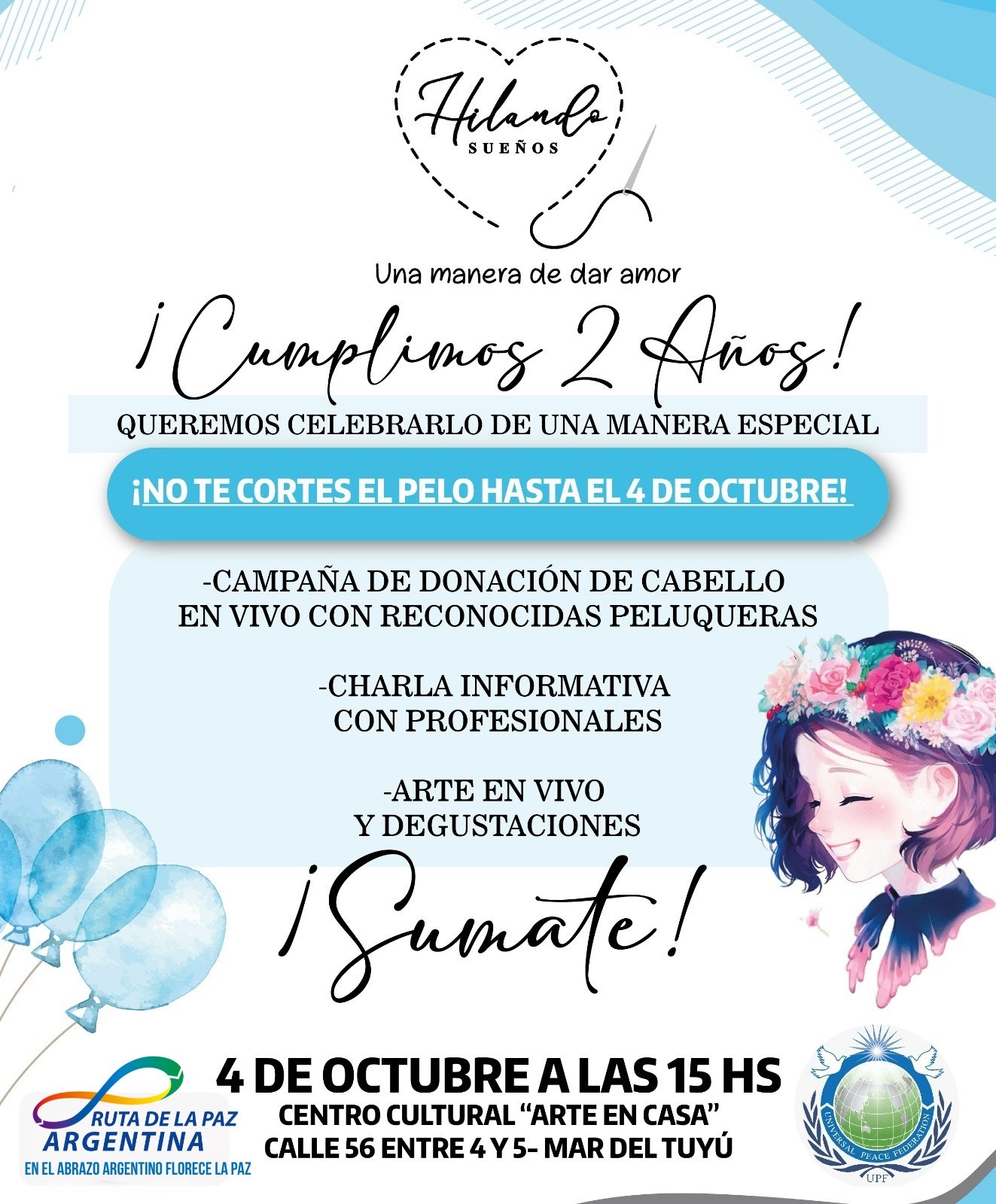 El próximo sábado 4 de octubre a las 15:00 horas, el proyecto solidario Hilando Sueños celebrará su 2º aniversario con una jornada especial en el Centro Cultural “Arte en Casa” (Calle 56 entre 4 y 5, Mar del Tuyú).