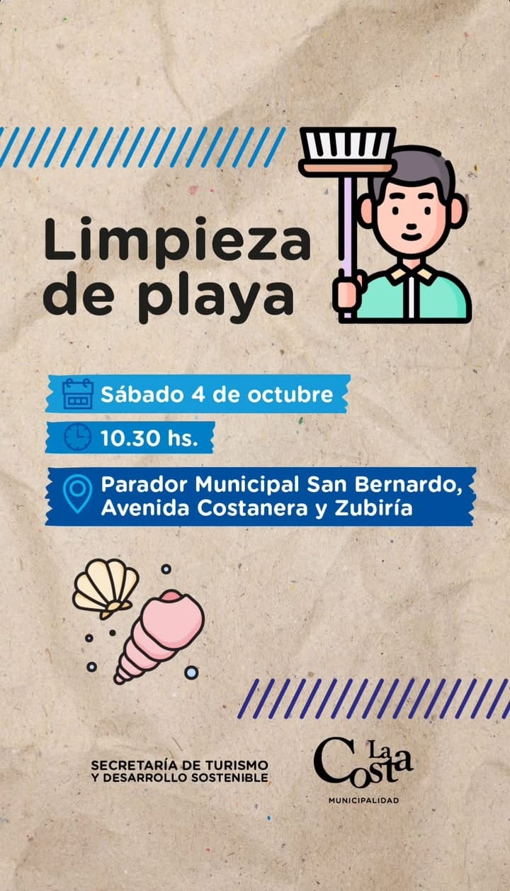 La Municipalidad de La Costa, a través de la Secretaría de Turismo y Desarrollo Sostenible, organiza una nueva jornada de limpieza de playa, que se llevará a cabo el próximo sábado 4 de octubre a las 10.30 horas en el Parador Municipal de San Bernardo (Avenida Costanera y Zuviría).