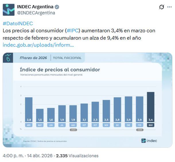 El Instituto Nacional de Estadística y Censos (INDEC) indicó que la inflación del mes de marzo fue del 3,4%, en medio de un escenario en el que tanto analistas privados como el propio Gobierno anticipaban una cifra superior al 3% mensual. De esta manera, se trata del registro más elevado desde marzo del año pasado.
