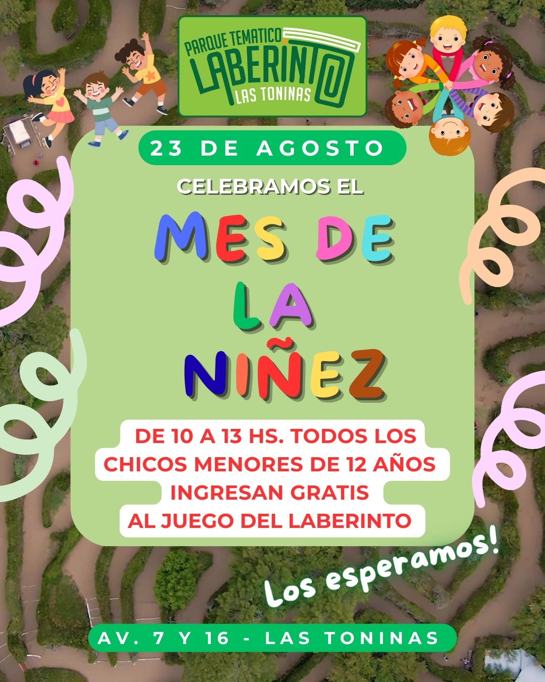 El Parque Temático y Religioso del Laberinto de Las Toninas anuncia que en el marco de la celebración por el Mes de la Niñez, el próximo sábado 23 de agosto, de 10 a 13 hs, todos los niños y niñas menores de 12 años ingresan GRATIS al juego del Laberinto de Las Toninas en Av 7 y 17.
