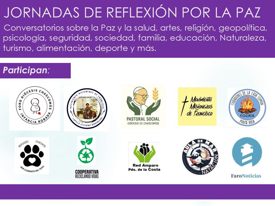 Los encuentros contarán con la presencia de diversas instituciones y movimientos, entre ellos: Foro Diócesis Chascomús Infancia Robada, Movimiento Misioneros de Francisco, Pastoral Social Diócesis de Chascomús, Aula de Mar, Cooperativa Reciclando Vidas, Red Amparo Partido de La Costa, Faro Noticias, Refugio Chichos, Cuidadores de la Casa Común, entre otros.