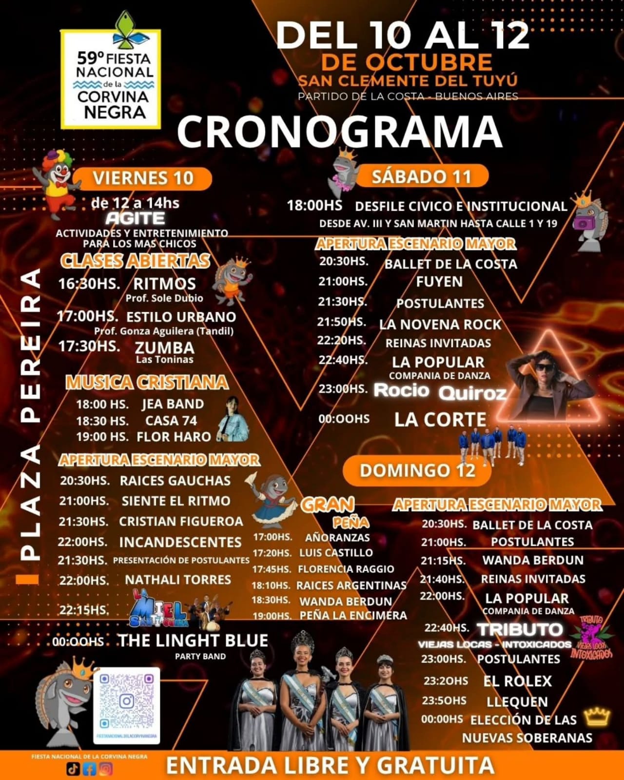 Del 10 al 12 de octubre, San Clemente del Tuyú celebra la 59ª Fiesta Nacional de la Corvina Negra, una festejo emblemático que reúne expresiones culturales, propuestas artísticas y actividades recreativas abiertas a toda la comunidad. El evento tendrá lugar en la Plaza Pereira, ubicada en las calles 13 y 20, con acceso libre y gratuito para toda la familia.