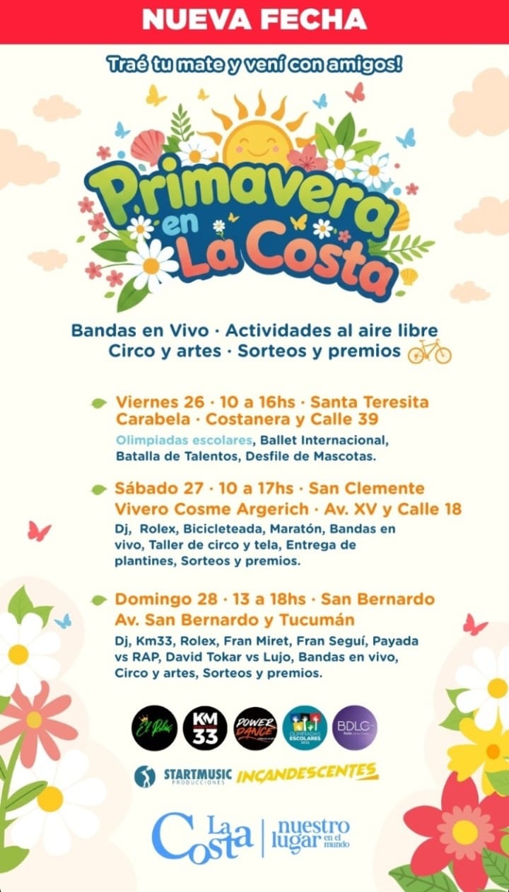 Las celebraciones de la primavera en el Partido de La Costa, que habían sido suspendidas el pasado fin de semana por razones climáticas, ya tienen nueva fecha: viernes 26, sábado 27 y domingo 28 de septiembre. Serán tres jornadas con espectáculos en vivo, deportes, actividades al aire libre y propuestas para toda la familia. Todas las actividades son libres y gratuitas.