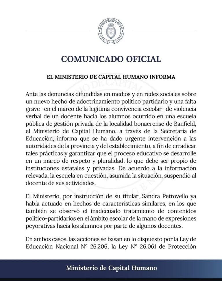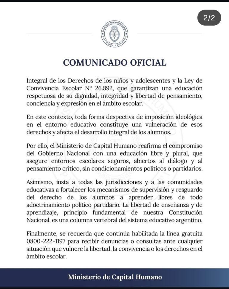 Casi en simultáneo, el Ministerio de Capital Humano —del cual depende el área de Educación— difundió un comunicado oficial recordando que “toda forma despectiva de imposición ideológica en el entorno educativo constituye una vulneración de derechos”.