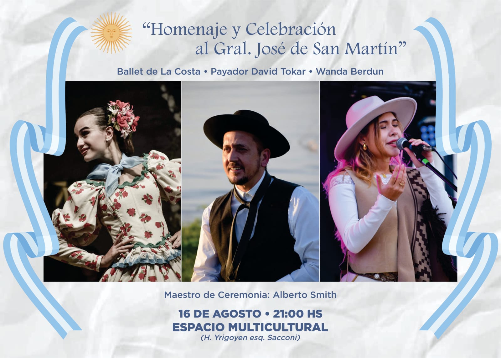 Mar de Ajo será escenario, el próximo sábado 16 de agosto a las 21:00 hs, de la Velada “Homenaje y Celebración al General San Martín”, que tendrá lugar en el Espacio Multicultural (H. Yrigoyen esquina Sacconi).